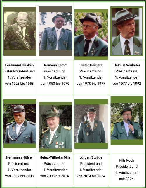 Ferdinand Hüsken hatte das Amt des Präsidenten bis 1953 inne, dessen Nachfolger Hermann Lemm bis 1970 als Präsident vorsaß. Anschließend übernahm Dieter Herbers die Präsidentschaft und führte den Verein bis 1977. Von 1977 bis 1992 hatte Helmut „Flocky“ Neukäter das Amt inne, bevor er es 1992 an Herman Hülser übergab, der den Verein bis 2008 leitete. Im Anschluss folgte HW Milz, der den Vorsitz sechs Jahre ausübte und 2014 niederlegte. Im Jahr 2014 übernahm Jürgen Stubbe den Vorsitz und führte die „Einigkeit“ erfolgreich durch die Coronazeit. Nach zehn Jahren, im Jahr 2024, übergab er die Vereinsleitung an Nils Koch. Dieser ist seit 2017 Mitglied der Einigkeit und war von 2021 bis 2024 3. Vorsitzender. Seit 2024 ist er nun 1. Vorsitzender und Präsident des BSV „Einigkeit“ Holthausen 1928 e. V.